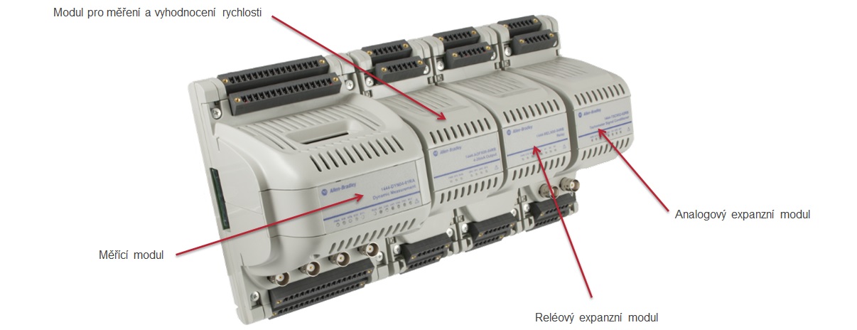 The Dynamix system consists of several parts. The main unit - measuring module measures and evaluates information from connected sensors. Its key feature is the integration into the Logix 5000 environment. The module contains a pair of shielded RJ45 ports, which can be used to communicate within the EtherNet/IP network with DLR, star or linear topology. An add-on profile is also available. In addition to the terminal block for connecting one to four vibration sensors, the module allows the connection of two more sensors for TTL speed sensing. There is also a double input for redundant power supply of the module, two non-isolated inputs, two isolated outputs and one relay contact.